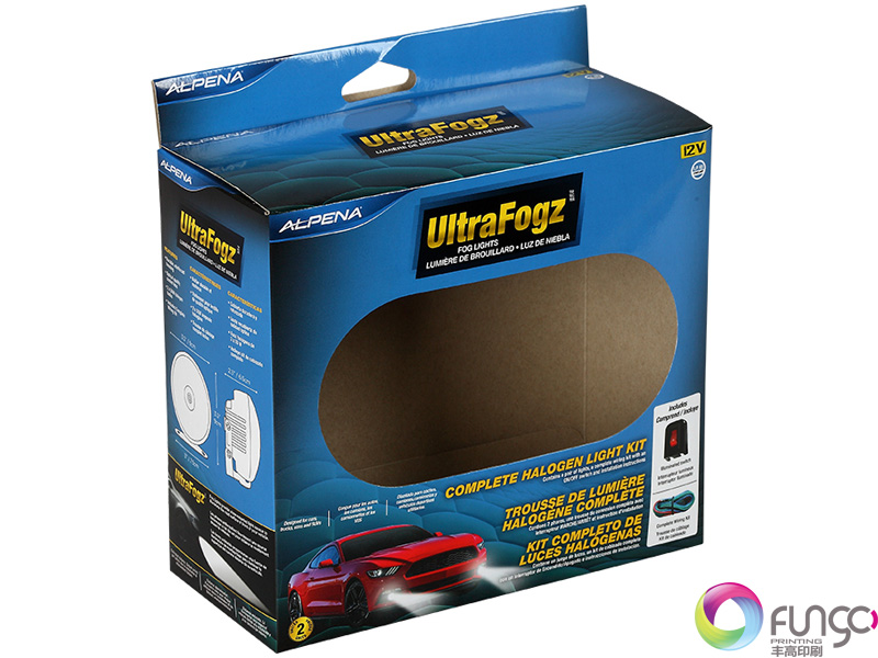 此款車載燈飾,采用四色彩印、灰底白版紙為印刷紙張、并膜切出精準的展示位置,從外部可觀察產(chǎn)品詳細,凸顯該燈飾高端。